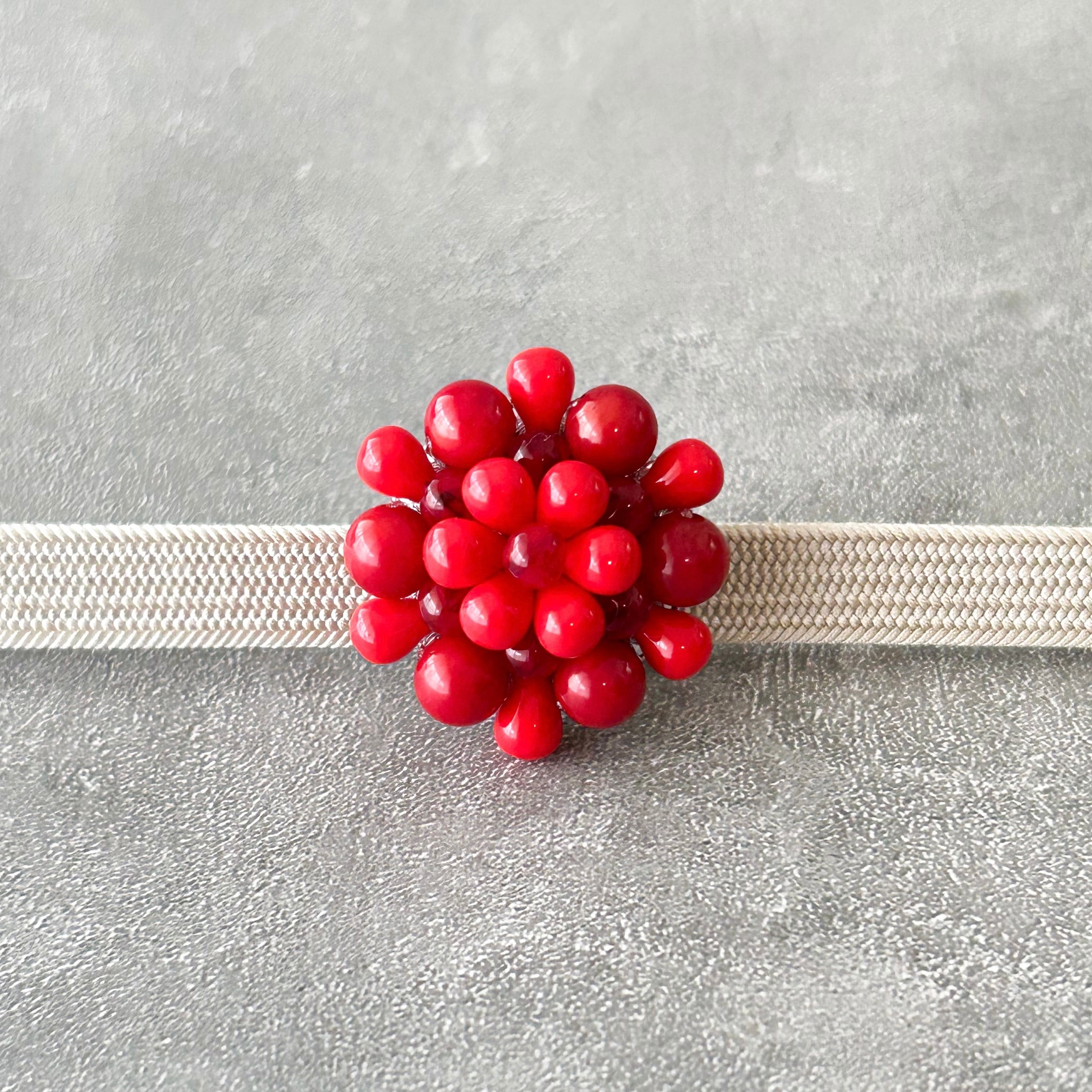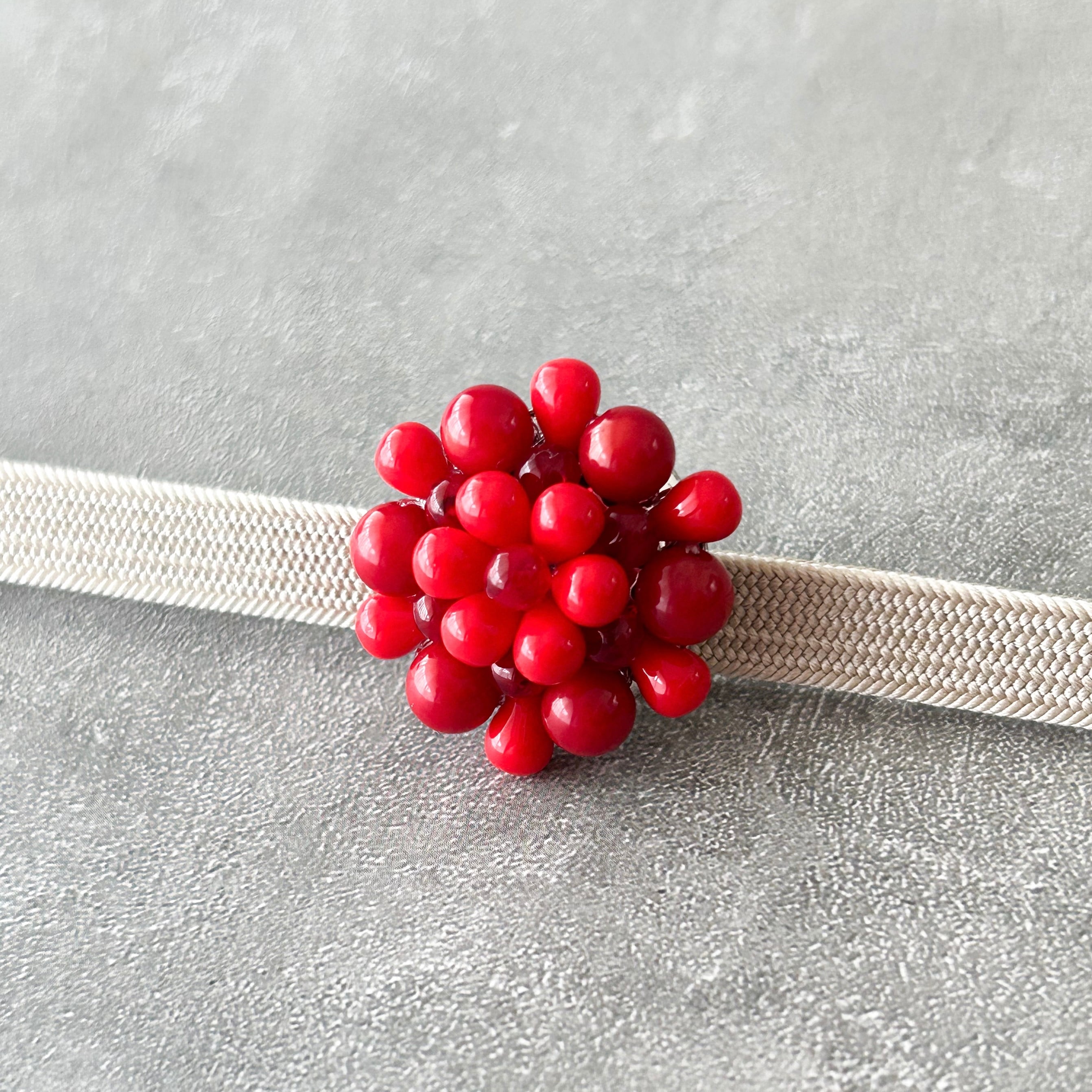 3種類の赤色を編み込んだ目を惹く帯留めです。