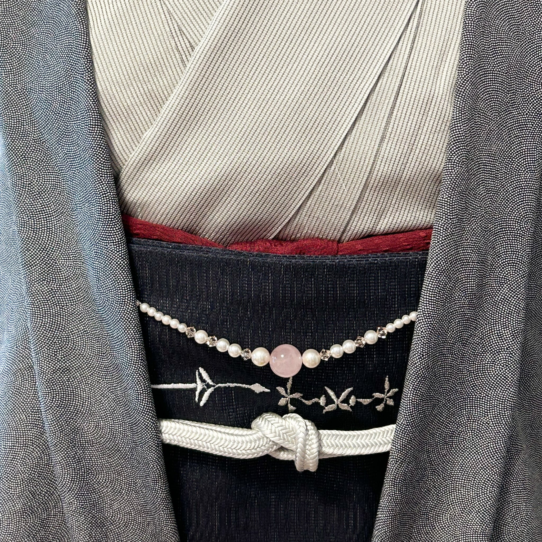 【格上げ羽織紐】天然石 ローズクォーツ×パール ビーズ ピンク シルバー金具 羽織留め 着物 クリップ